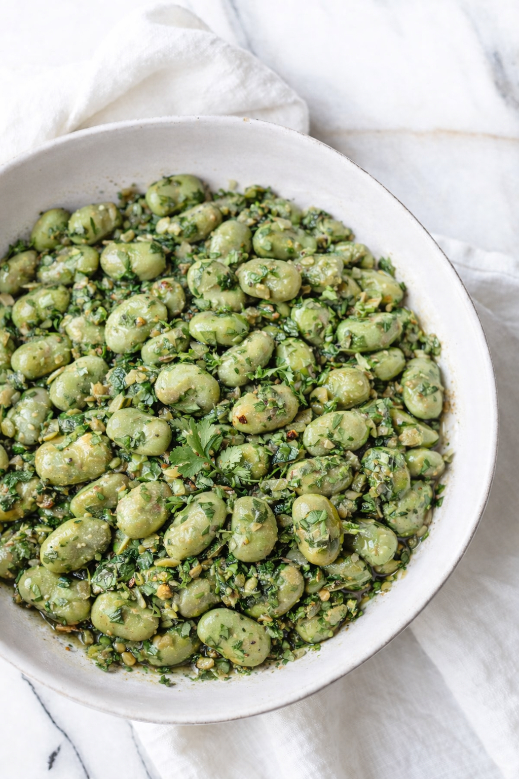 Zachte tuinbonen gemengd met verse kruiden, knoflook en een verfijnde dressing van olijfolie. Licht, fris en vol natuurlijke smaken – wordt met brood en yoghurt saus gereserveerd