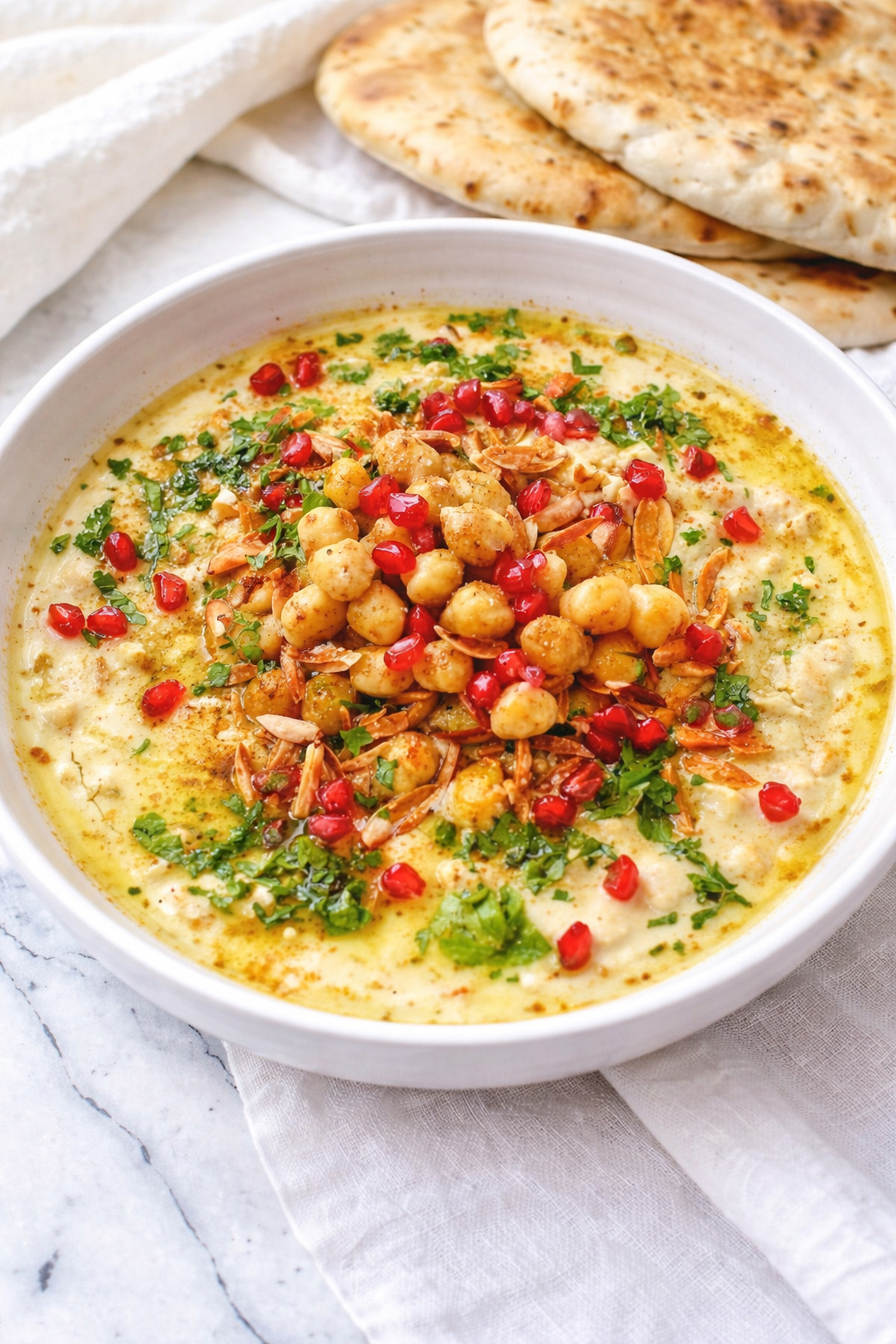 hele kikkererwten en overgoten met een fluweelzachte tahinisaus dat verfijnd met knoflook en citroen,. Afgewerkt met olijfolie en een vleugje komijn voor een pure, authentieke smaakbeleving.