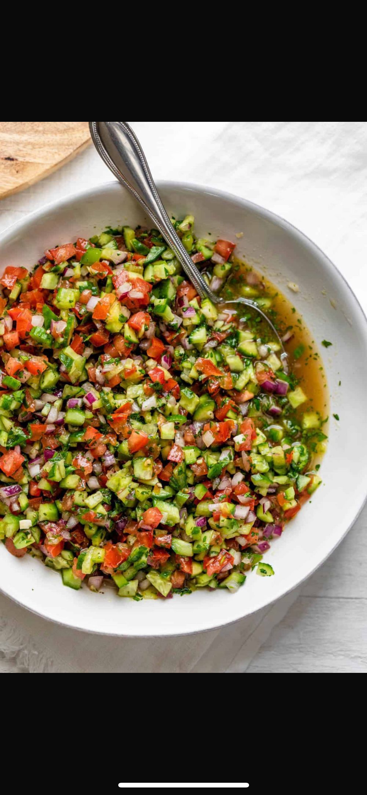 Tomaat, komkommer, ui, peterseilie, munt, met dressing van citroen en olijfolie